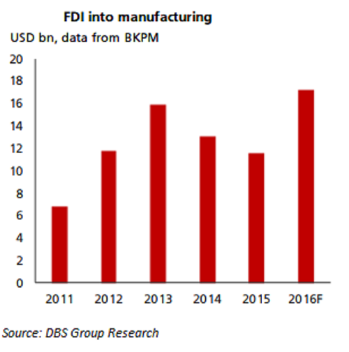 Foreign direct investment (FDI) rose to USD 6 billion in 3Q, well above the USD 3.8bn average of the first half of the year. Still, FDI this year is likely to come in circa USD 19 billion, 6 percent lower than in 2015 and the lowest figure since 2011, DBS reported.