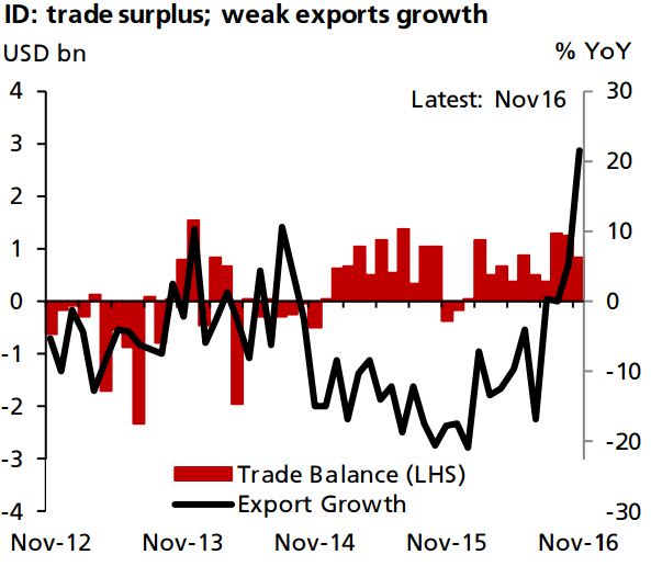 Indonesian trade balance data for December is expected to be released on Monday, January 16 at 04:00 GMT. We foresee that the trade surplus will increase to USD8 billion, higher than the precious reading of USD7.7 billion, supported by the stronger growth in the country’s exports of around 7 percent y/y. The acceleration in export growth in the last-quarter of 2016 was definitely encouraging for the outlook on external balances this year.