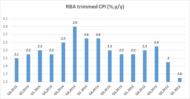 - However, Reserve Bank of Australia's preferred measure trimmed inflation rose only by 0.3% in third quarter, which is weakest since third quarter last year. Yearly CPI came at 2.1%, against median expectation of 2.4%, which is lowest since second quarter of 2012.