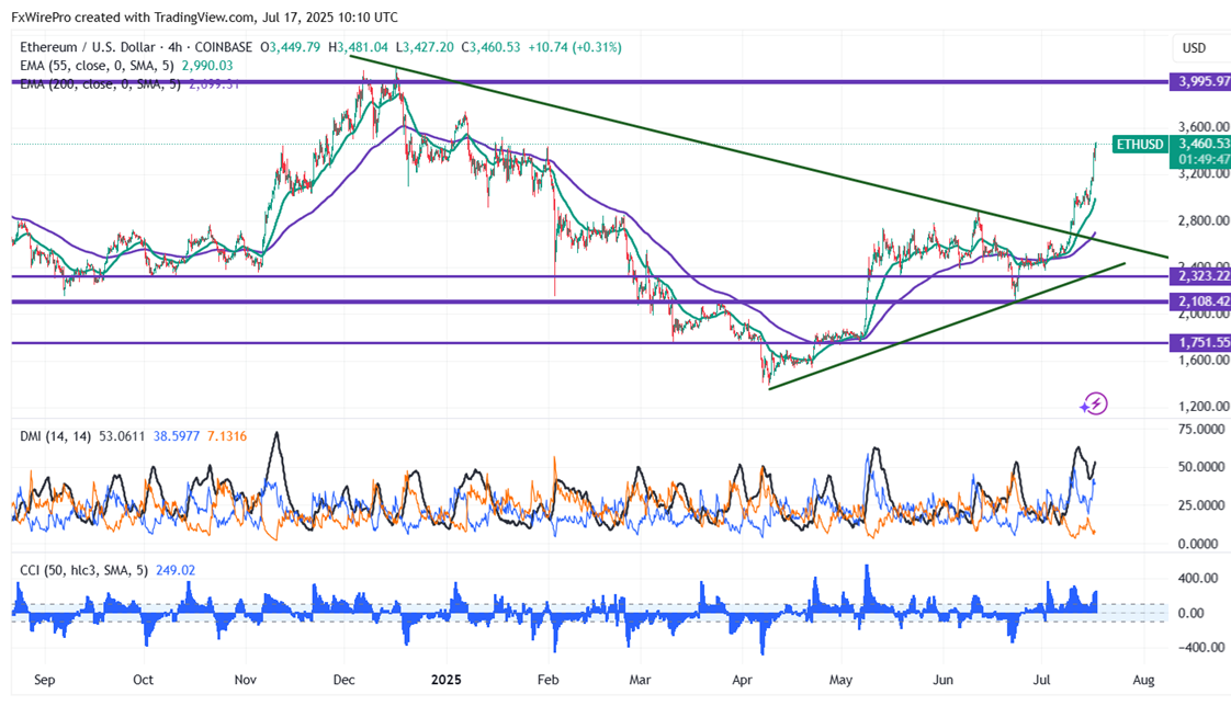 ETHUSD surges above $3400 on strong accumulation by institutional. It hits an intraday high of $3481 and is currently trading around $3454.