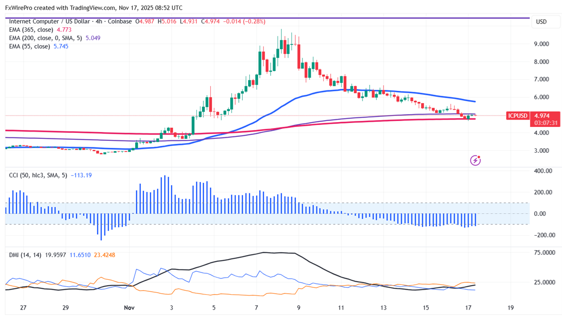 ICPUSD declined more than 50% in past one week.The pair holds well above the short-term (34 and 55 EMA) and long-term moving average. It hit a high of $9.83 (Nov 8th 2025) and is currently trading around $4.94.