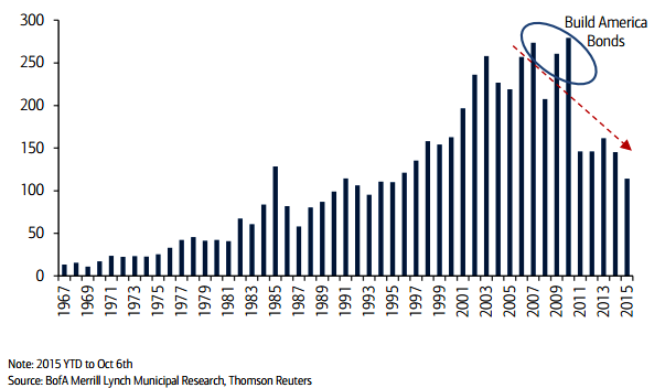 And seven years after China went "all-in" on fiscal stimulus, a shift toward QE/rates/FX to support activity would be likely in the east. The combination of very low bond yields & very low commodity prices means it's the perfect time to finance infrastructure spending. And municipal bond issuance for capital spending on transportation, infrastructure and state spending is actually running in 2015 at its lowest level since 1997.