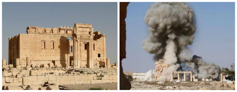 Left: Temple of Bel in April 2010, Palmyra, Syria. Right: ISIL propaganda image showing the temple’s destruction in 2015. (Left: Bernard Gagnon; right: ISIL propaganda), CC BY