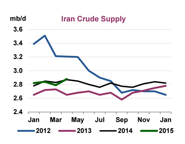 - 2015 so far, seeing increase in oil production in Iran. Production now stands at highest level since 2012. In April, production climbed by 90,000 barrels/day to 2.88 million barrels/day. That is still far from what Iran was producing before sanctions were imposed (approx. 4 million barrels/day).
