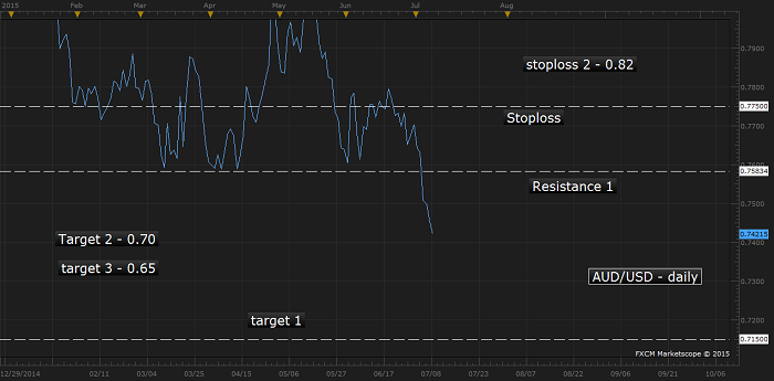 - Sell Aussie against dollar targeting 0.715 as initial target, 0.70 as second one and 0.65 as final target. Stop loss should be maintained around 0.775 and 0.82 area.