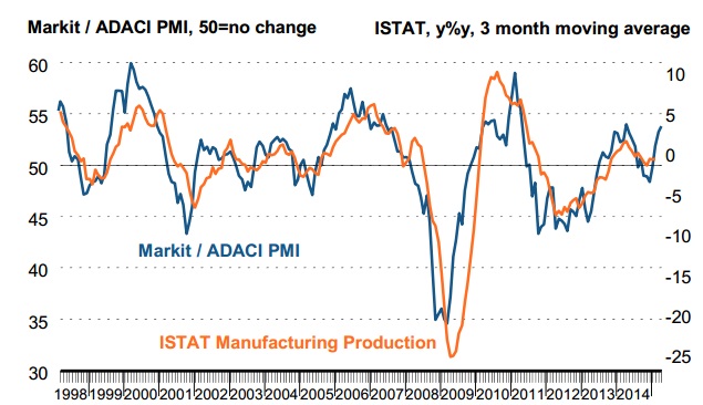 - Weaker Euro is helping Italy to become powerhouse for manufacturing, with new orders rising sharply. Companies in China are reported to be using lower Euro to manufacture goods in Italy to boost their brand, with a "Made in Italy" stature.