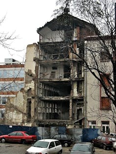 Ruins of the RTS in Belgrade which was bombed by NATO aircraft in 1999. WhiteWriter via Flickr., CC BY-SA