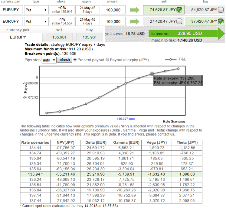 This trade strategy is advisable only when the underlying exchange rate is projected to move higher or sideways so that put expires worthless and you keep the entire premium.