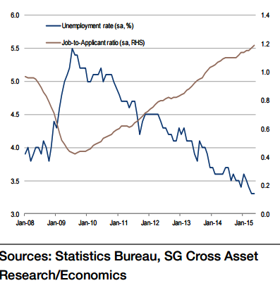 "However, if this situation fails to materialise, the BoJ's 2% price stability target will be difficult to achieve. The unemployment rate needs to fall below 3% for the target to be met, but this level currently seems very far away. The job-to-applicant ratio is likely to remain at 1.19 in June, the highest level since 1992", added Societe Generale.