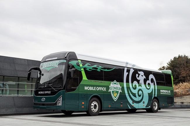 The K League 1 football club Jeonbuk Hyundai Motors has received the Universe Operation and Control Car, a remodeled version of the premium Universe express bus to provide office space on the road, from Hyundai Motor Co.
