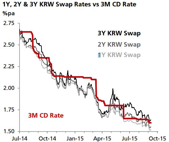 The market is pricing an outside chance of rate cuts within the next six months as sentiment on the Korean economy sours. The market is more dovish for the Bank of Korea (BoK) to keep the policy rate unchanged at 1.5% through to 3Q16.