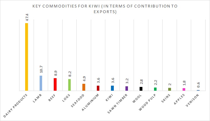 - Importance of Dairy products highest for New Zealand economy (47.4%), followed by Lamb (10.7%), Beef (8.9%), Logs (8.2%), Seafood (4.9%), Aluminium (3.6%), Kiwi fruit (3.6%), Sawn Timber (3.2%), Wool (2.8%), Wood pulp (2.2%), Skins (2%), Apples (1.8%) and Venison (0.6%).