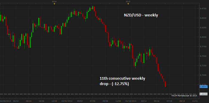 New Zealand Dollar, on its way to continue longest weekly decline on record, which now stretched for 11th straight week.