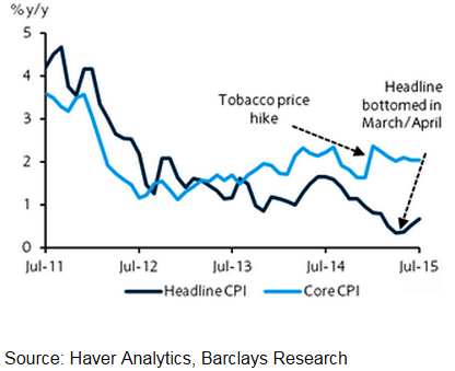 "Looking ahead, inflation is expected to gradually rebound in H2 to an average of 1.2% on account of firming services as the shock from the MERS outbreak dissipates. Higher food prices on the back of warmer and drier weather conditions will also help keep inflation supported", says Barclays.