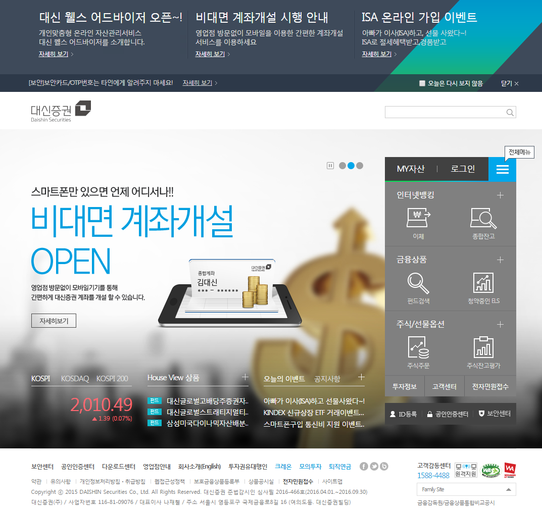Daishin Securities is engaged in the securities dealing, brokerage and underwriting businesses, covering corporate bonds, government bonds, options, foreign exchanges, initial public offerings (IPOs), exchange traded funds, cash management accounts (CMAs), equity linked securities (ELSs), fund wrap accounts, investment strategy consulting and bond analysis services. Founded in the 1960s, it operates 84 branches within Korea, with subsidiaries in China and Japan. As of May 2013, investors had paid in roughly KRW 434.8 million (approximateky $380 million), in capital, CoinDesk reported.