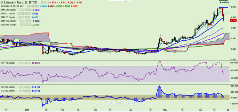 The long-term trend remains to be bullish. LTC/EUR is trading well below Tenken-Sen and Kijun-Sen. There is a possible dip till 3.90/3.60.