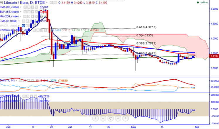 LTC/EUR is seen facing a strong resistance on Wednesday. The pair has broken minor resistance at 9-day EMA around 3.34 and jumped till 3.4100 levels (BTCE). It is currently trading around 3.411 at the time of writing.