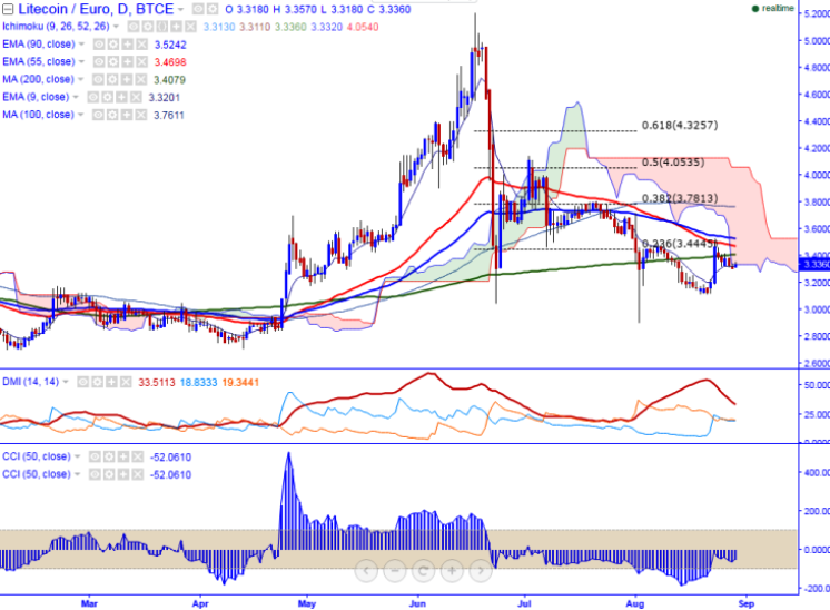 LTC/EUR is seen facing a strong resistance and trading above on Monday. The pair has made a temporary top around 3.50 and slightly declined from that level (BTCE). It is currently trading around 3.359 at the time of writing.
