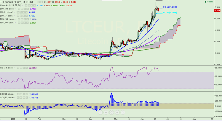 Long-term trend remains to be bullish. ETH/EUR is facing strong support near 7 days EMA and is expected to break the level 4.78 in the coming days. So dip till 4.40/4 is likely.