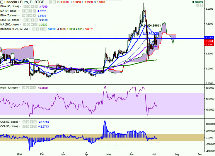 Long-term trend remains to be bullish. Short- term trend seems to be bearish. In daily chart LTC/EUR is trading well below Tenkan-Sen and Kijun-Sen. So a decline till 3.65/3.40 is possible.