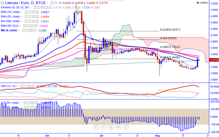 LTC/EUR is seen trading above due to the recent addition of Litecoin trading in GDAX platform to meet the demands of its customer base. The pair retraced sharply from the low of 3.1190 made on Aug 22nd 2016 low (BTCE). It is currently trading around 3.4170 at the time of writing.