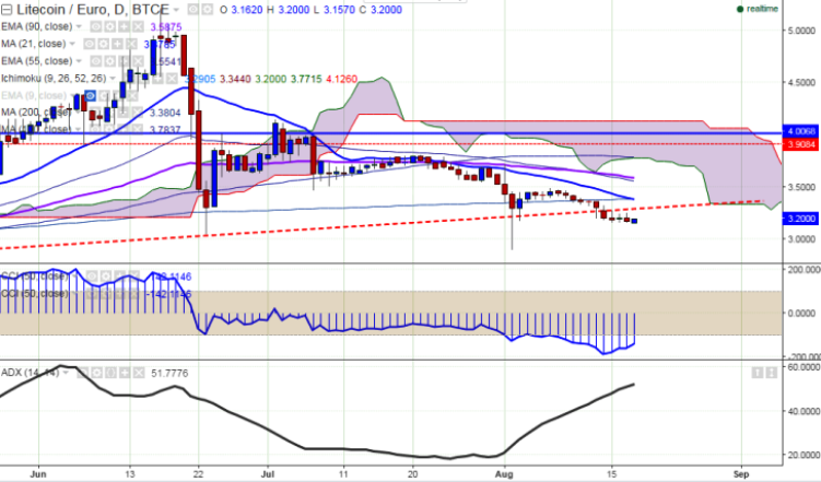 LTC/EUR is seen recovering slightly on Thursday after the plunge. The pair has slightly recovered till 3.20 at the time of writing from the low of 3.1570 levels (BTCE) made yesterday. It is currently trading around 3.20 at the time of writing.