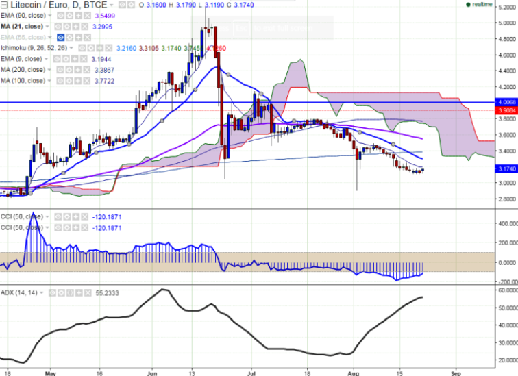 LTC/EUR is seen trading flat on Monday. The pair is trading in a narrow range between 2.90 and 3.49 for the past three weeks (BTCE). It is currently trading around 3.1710 at the time of writing.