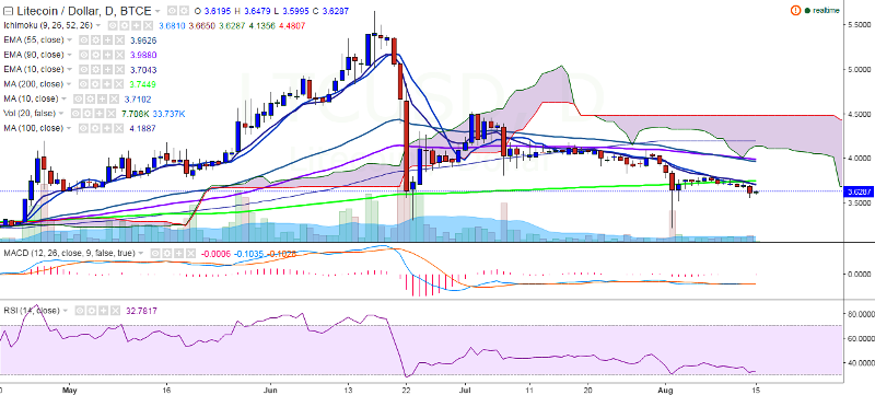 LTC/USD continues to trade weaker and has hit a low of 3.55 yesterday. It currently trades at 3.61 levels at the time of writing (BTC-e).