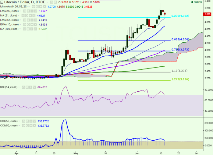 LTC/USD has recovered from the lows of 4.83 levels (BTC-e) seen on Tuesday and is trading at 5.06 levels at the time of writing.