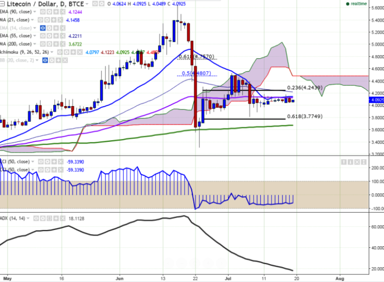LTC/USD continued its choppy trade seen from the past several days. The pair has been unable to break above the 90 EMA and continues to trade below it. It currently trades at 4.08 levels at the time of writing.