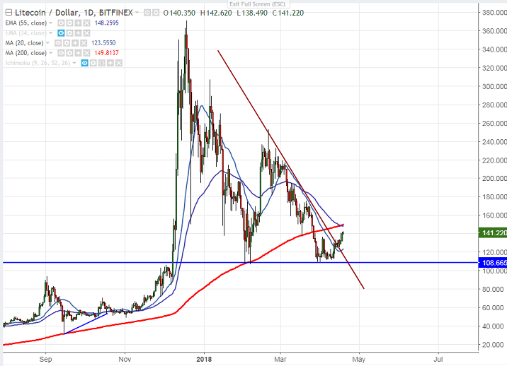 - LTC/USD shown almost 70% decline from temporary top around $370 made on Dec 19th 2017 high. The pair has formed major double bottom around 106 and shown a good jump of more than 30% till 142.62. It is currently trading around 140.87.