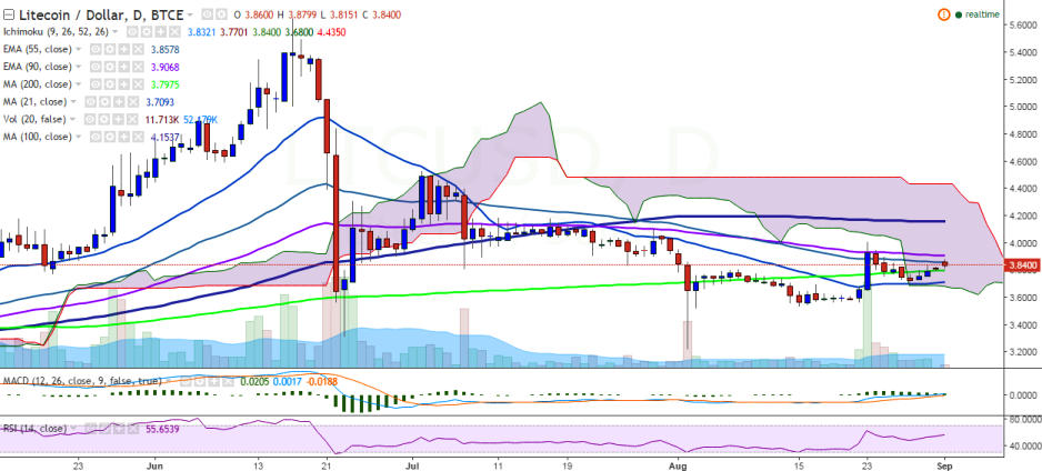“After closing above 200-day MA on Wednesday, the pair moved further north today. LTC/USD should break above the temporary high of 4.01 levels seen on August 23 for further upside”, FxWirePro said in a statement.