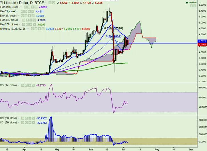 LTC/USD sharply plunged on Tuesday, after hitting $4.45 levels (BTC-e) so far in the day. It currently trades at $4.23 levels, at press time.