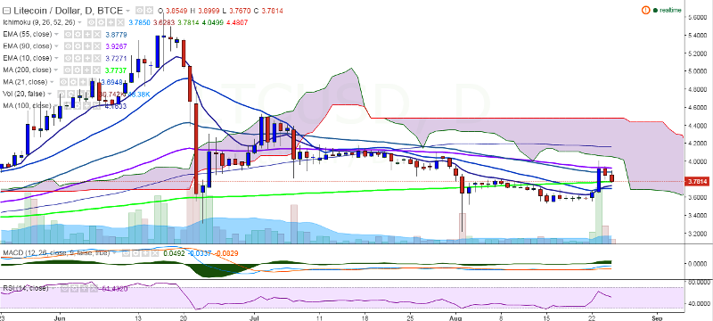 LTC/USD failed to hold its ground above 90 EMA, hit on Tuesday and has declined sharply. The pair touched major trend line 200-day MA earlier in the day and currently trades at 3.79 levels at the time of writing (BTC-e).