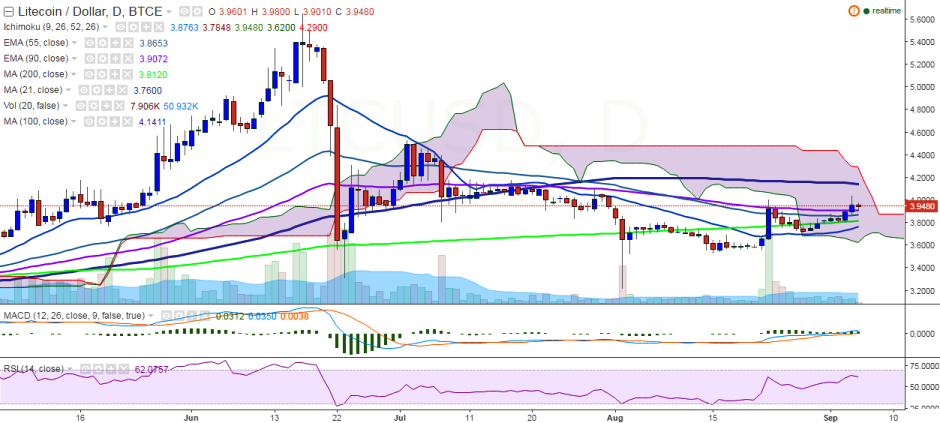 “LTC/USD is showing a slight dip after hitting 4.03 levels on September 04 and is trading close to 90 EMA. The pair must break above 4.00 levels for further upside”, FxWirePro said in a statement.