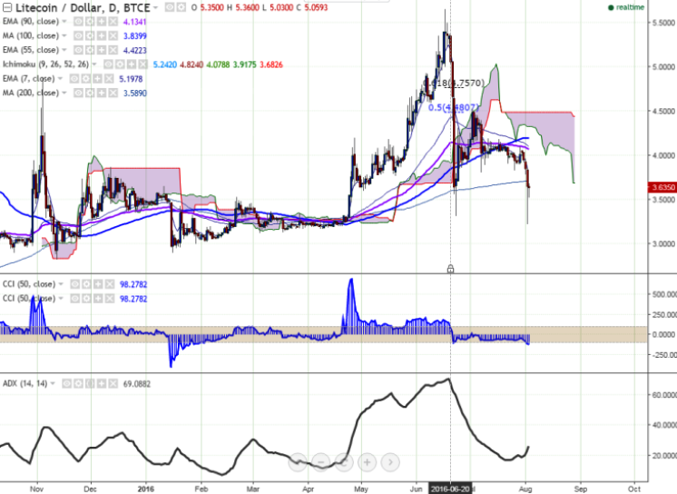 LTC/USD has recovered from the lows of 3.22 levels hit yesterday, however, it continues to trade well below 200 day MA. It is currently trading at 3.63 levels at the time of writing (BTC-e).