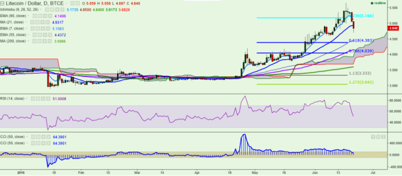 LTC/USD considerably weakened on Tuesday and fell to 4.69 levels (BTC-e). It has recovered slightly and currently trades at 4.82 levels at the time of writing.