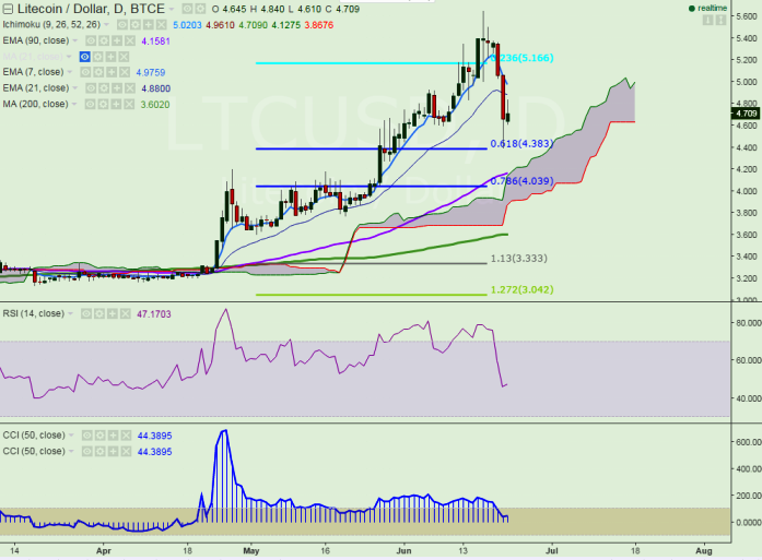 LTC/USD slightly recovered on Wednesday and hit a high of 4.84 levels so far in the day. It currently trades at 4.69 levels (BTC-e) at the time of writing.