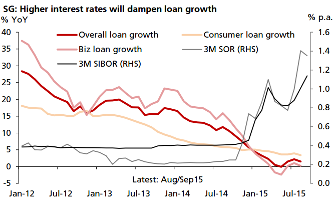 The economy has contracted by 4.0% QoQ saar and risk of another quarter of contraction has risen significantly over the past 2 months. In addition, business loans in particular are linked to the Swap Offer Rate (SOR). And unlike the interbank rate (SIBOR), SOR tends to be more volatile as it is also linked to currency movements. Depreciation in the SGD, following the weaknesses in Asian currencies, has already led to the spike-up in SOR. With an overarching Fed hike expectation, risk is for interest rates to rise further. Higher interest rates will continue to take the toll on loan growth in the coming months.