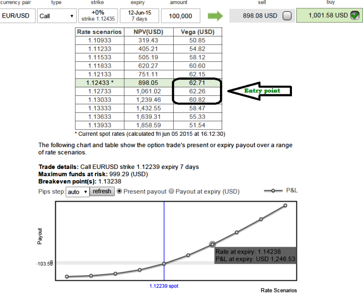 At spot trading EUR/USD 1.1243 Vega is 62.71, which means for every 1% change in implied volatility the above option premium is likely to change around US$60.