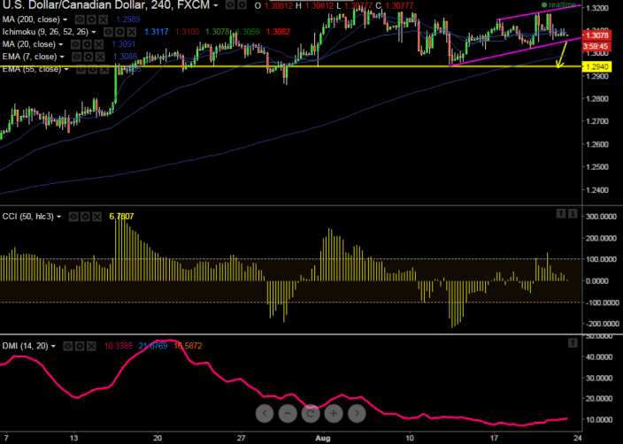USD/CAD has not able to break above trend line resistance around 1.3190 (trend line joining 1.3150 and 1.3176) and declined till 1.3050 level. It is currently trading at 1.3083.