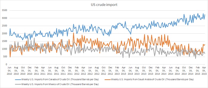 To boost the bulls, another set of hard fact is presented in the chart that shows since April last year US oil imports from Canada has been increasing over imports from others.