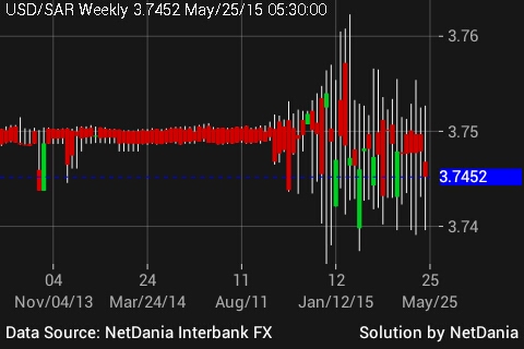 Saudi Arabian Riyal has been pegged to US Dollar since 2003, officially at 3.75. This year the peg is experiencing pressure and volatility as dwindling oil revenue puts pressure on Saudi coffer.