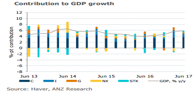 "We revise our full year 2017 GDP growth forecast to 5.3 percent (prev: 4.9 percent) given the stronger-than-expected Q2 outturn. Implicit in the upward revised full year growth forecast, though, is a growth moderation in H2 of 4.9 percent y/y as compared to the 5.7 percent registered in the preceding quarter," ANZ Research commented in its latest report.