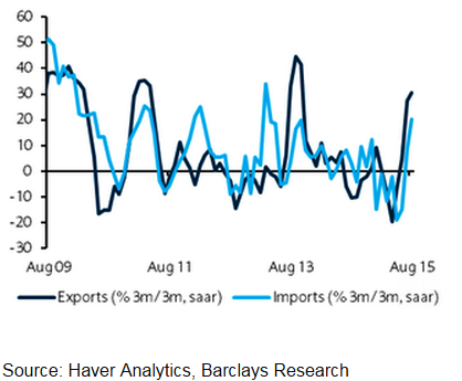 "Export momentum remains resilient, but likely to soften going forward. With the higher currency volatility in Asia and weakening demand in China, Malaysia's export performance is likely to remain modest over the rest of 2015. In terms of markets, exports to China remain strong (32.4% y/y), as well as to the US (24.2% y/y)", says Barclays.