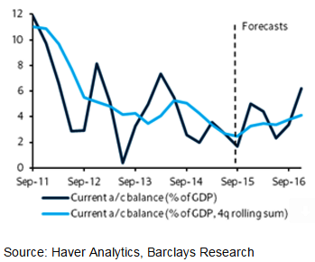 "We now expect Malaysia's current account surplus to be 3.4% of GDP in 2016, down from 4.5% of GDP in 2015", says Barclays in a research note.