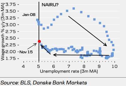 The labour market is key to understanding why the Fed wants to begin hiking cycle. Lets break down "long-run Phillips curve" to understand, and begin by comparing the US and UK labour markets. In UK, wage growth can be subdued for a long time and suddenly increase very quickly when the unemployment rate reaches the NAIRU. Whereas wage growth in the US, as measured by average hourly earnings, has already begun to show the same signs as illustrated in the chart above.