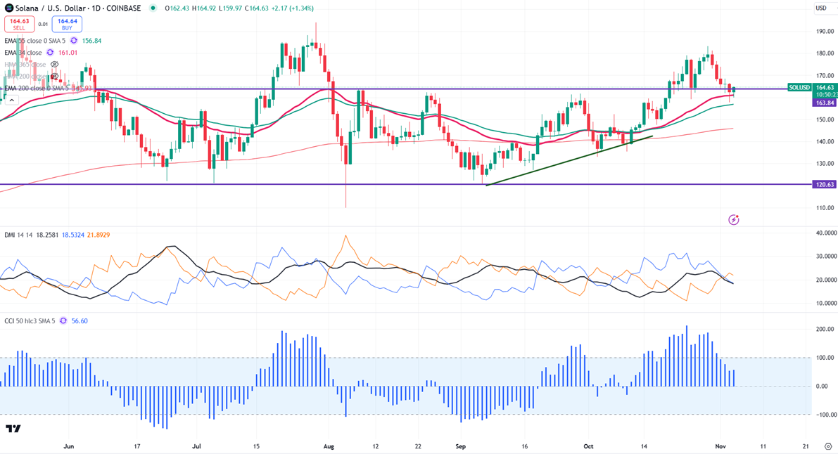 SOLUSD pared most of its gains after hitting a multi-month high $183.92 and is trading around $164.27. The near-term support is around $156 and any violation below that could target $145/ $127, $120, or $110.