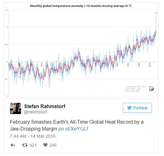 And another one bites the dust. The year 2014 was the warmest ever recorded by humans. Then 2015 was warmer still. January 2016 broke the record for the largest monthly temperature anomaly. Then came last month.