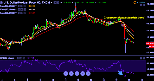 - Yesterday within a minute, Mexican Peso appreciated sharply around 544.7 pips against US dollar.